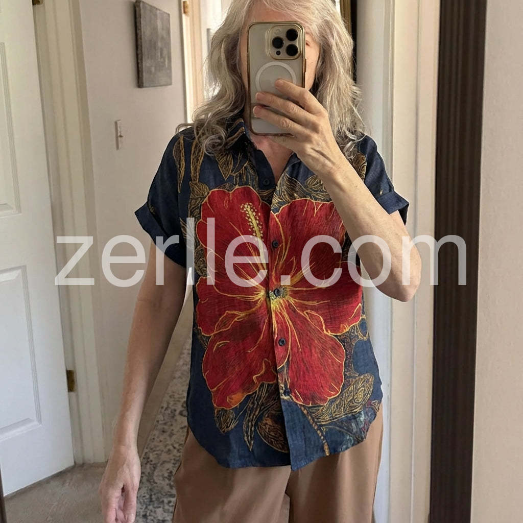 The detail on the gold leaves and the big red flower is gorgeous. It does not look cheap at all. Definitely one of my favorite summer shirts now.