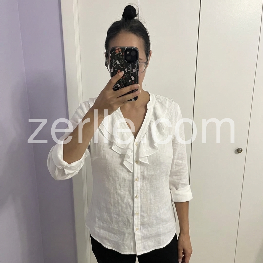 Beautiful shirt! The ruffle detail around the collar is so pretty and frames the face nicely. It has a relaxed fit that is very forgiving but still looks chic. Highly recommend.