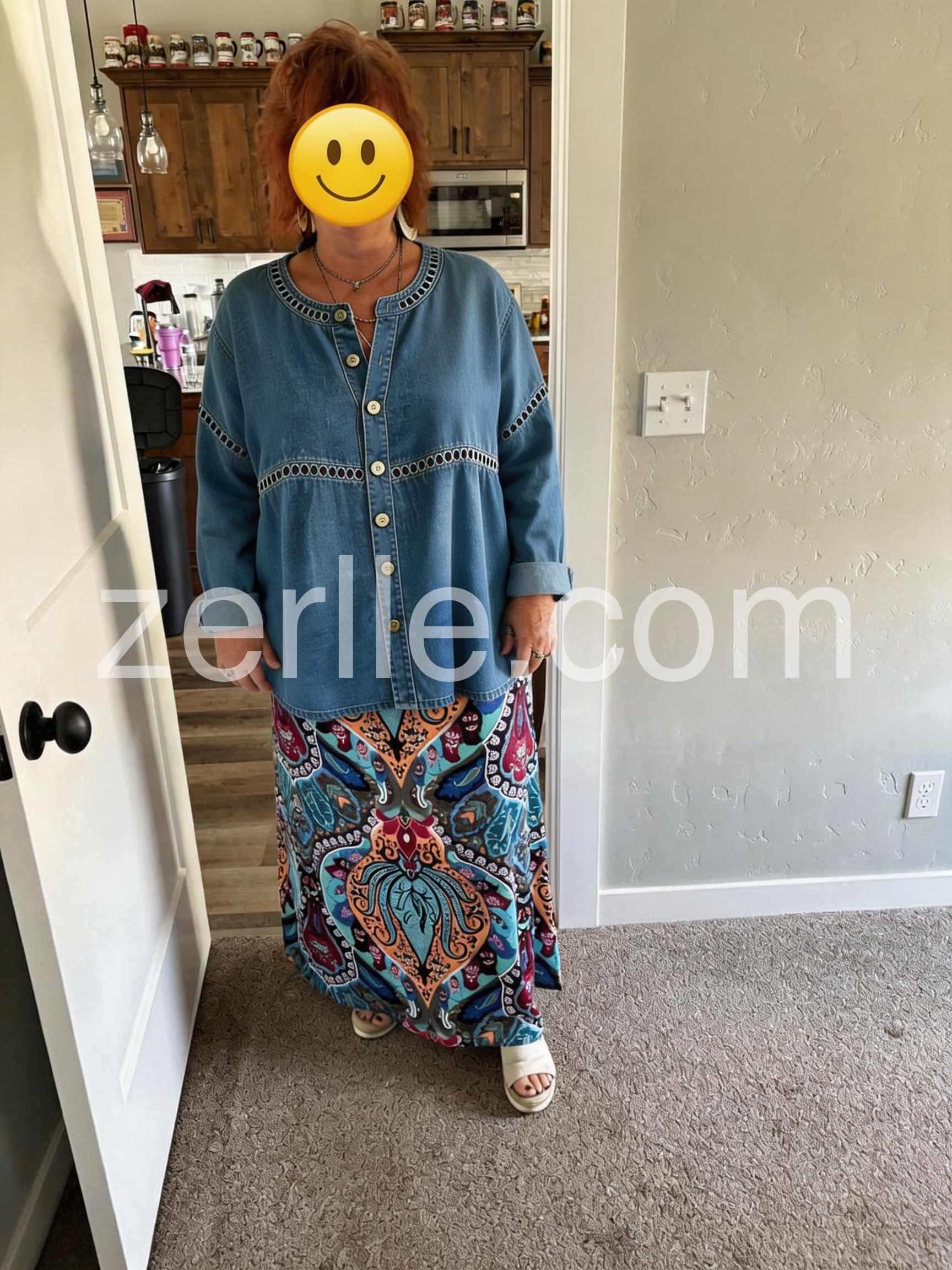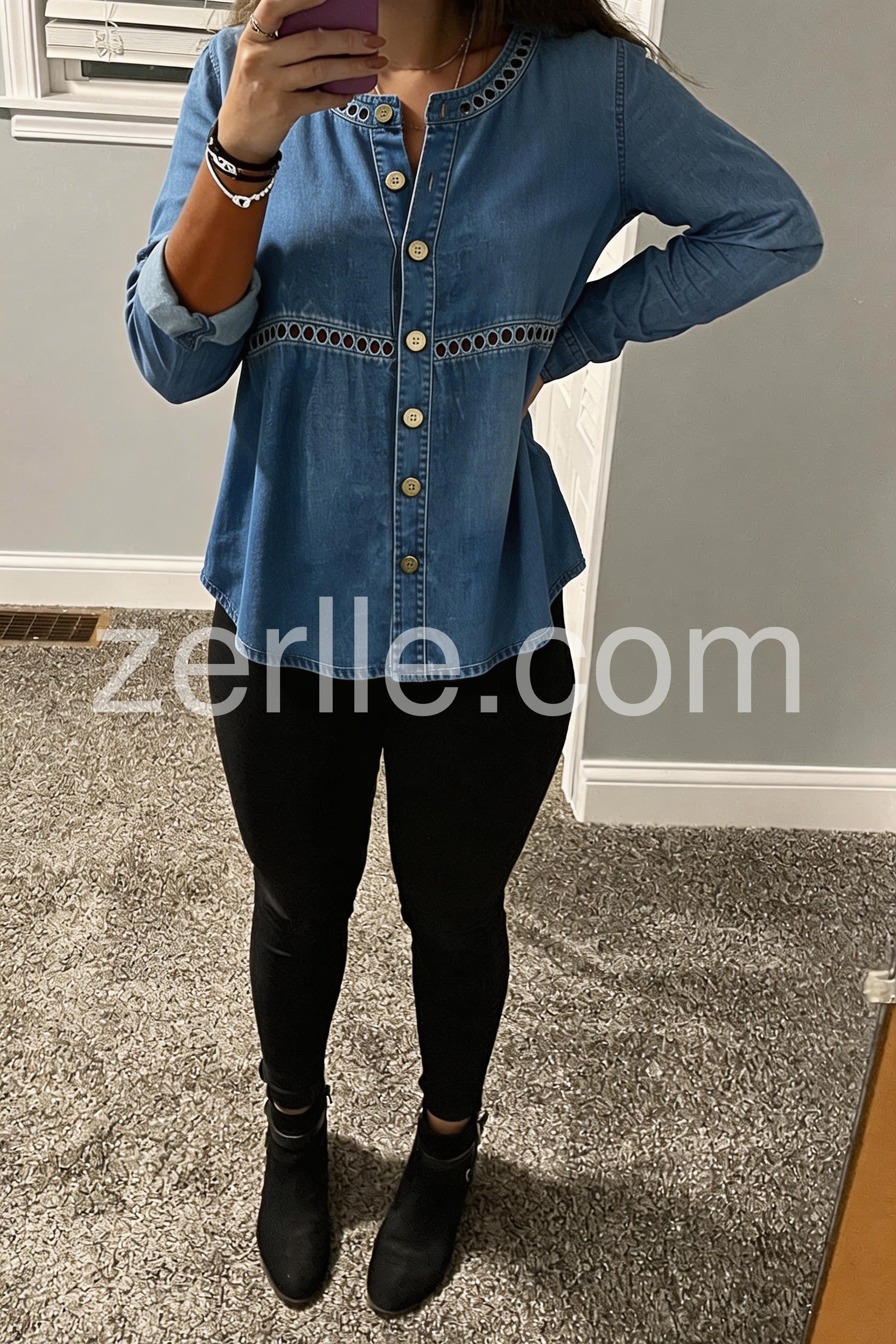The little cutout embroidery around the waist and neckline makes this stand out from a basic denim shirt. It washes well and did not shrink. Very happy with this purchase.
