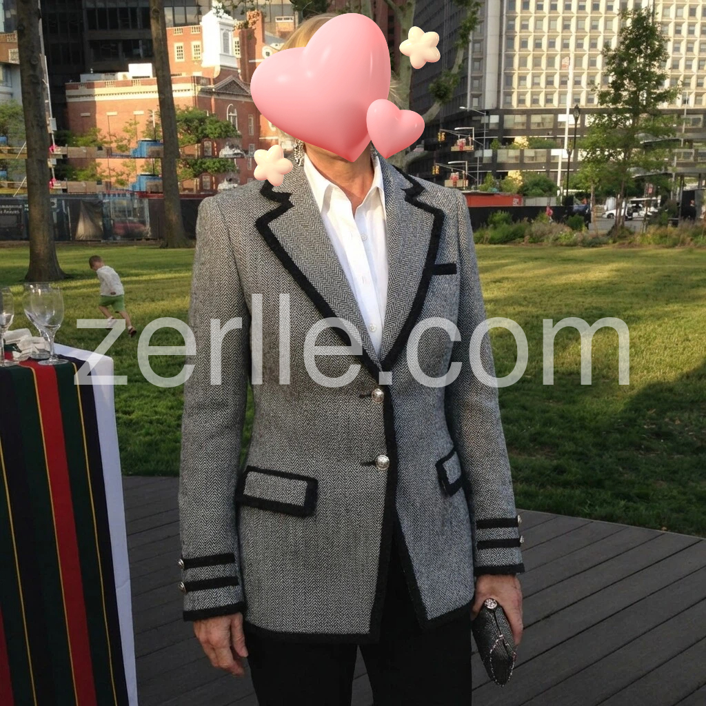 Chic Herringbone Blazer with Black Trim and Classic Double Breasted Design