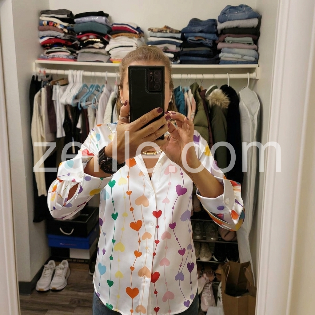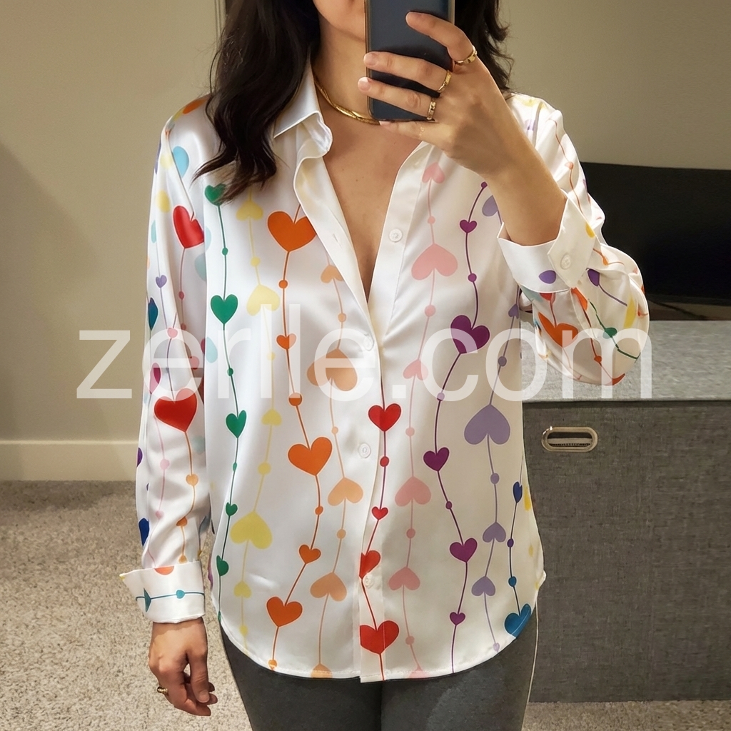 I can’t stop wearing this shirt! The design is so charming—hearts in different colors with a lovely flowing layout. I really appreciate how the fabric falls nicely, making it flattering even if I’m not wearing it perfectly tucked. The shirt also looks great with accessories and bracelets, and it instantly elevates a simple denim outfit. It’s sweet, trendy, and very comfortable.