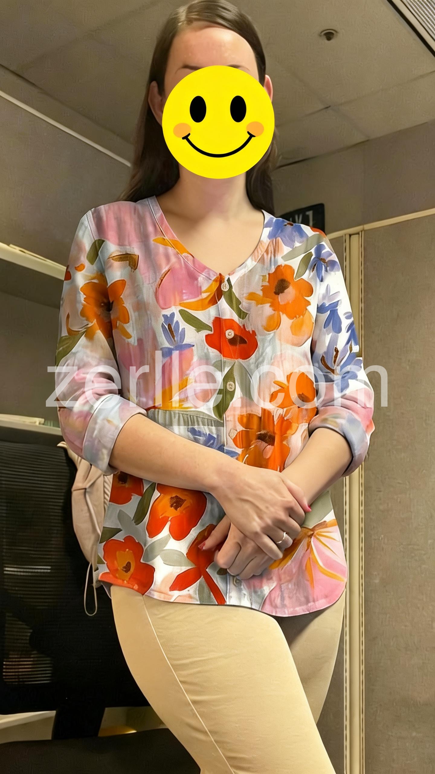 This blouse is so flattering. It has a slight flowy cut that hides my midsection without looking bulky. The colors are beautiful oranges, pinks, and blues.