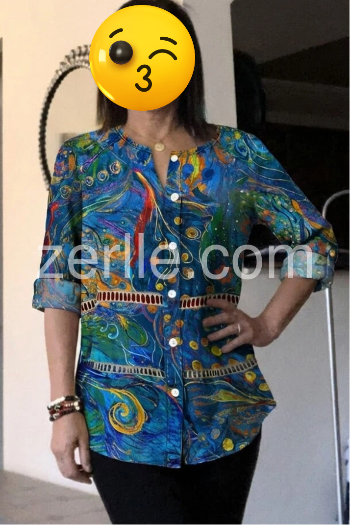 Such a fun and artsy shirt! I really appreciate the little details, like the white buttons and the horizontal lace inserts. The roll-up sleeves are super convenient. It washes well and hasn't faded at all. Highly recommend!