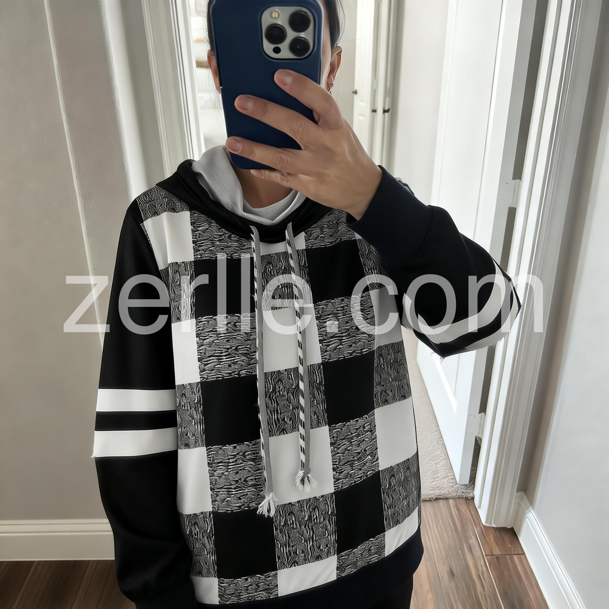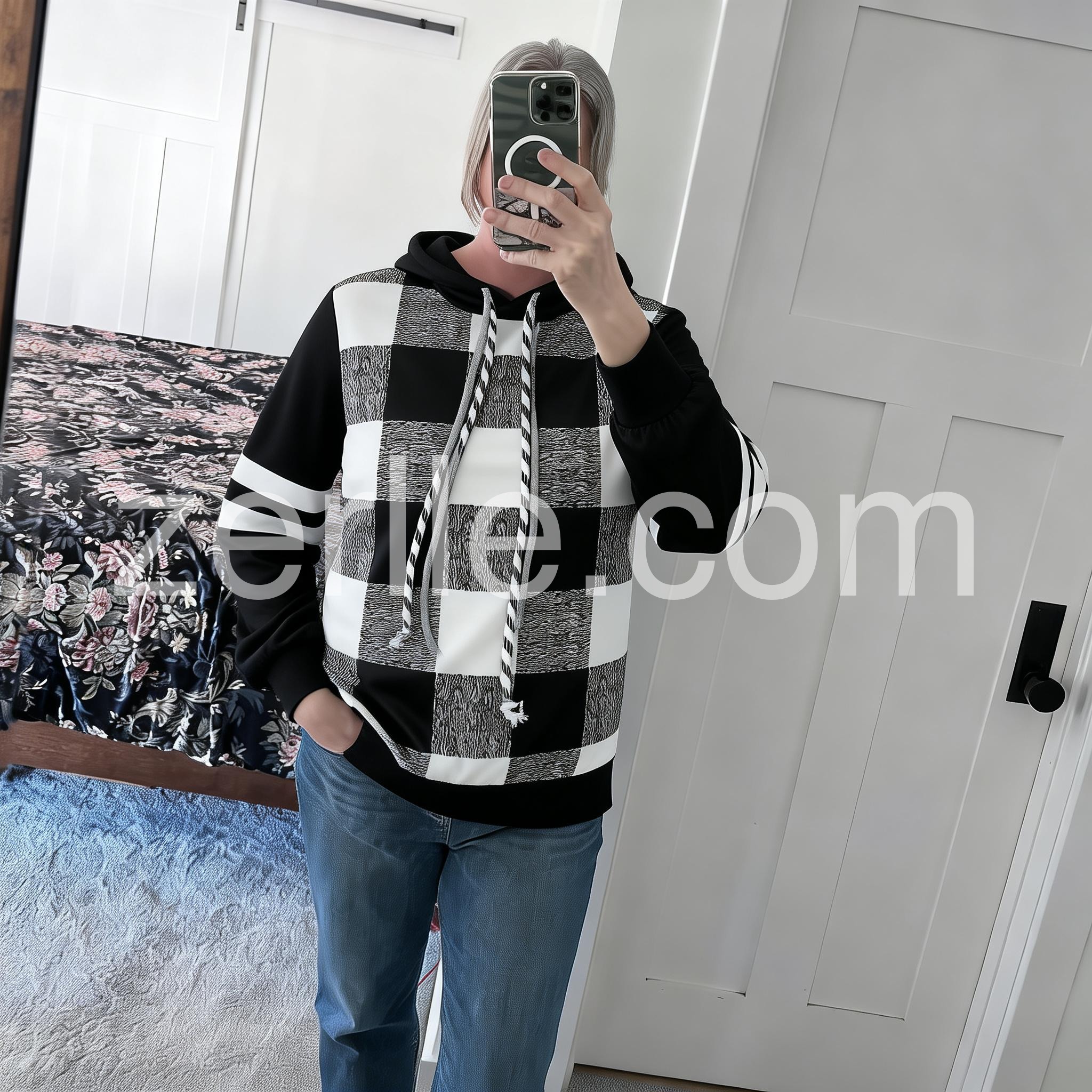 This sweatshirt is super soft. So comfortable but yet super cute. I love comfortable clothes. The sleeves are nice and wide. The hoodie on the sweat shirt add so much style. You can’t go wrong with style and comfort. You can definitely dress this down with a pair of leggings or dress it up with a nice pair of jeans. True to size. Overall a casual pull over hoodie that everyone needs. This will add much style to your wardrobe. Recommend.