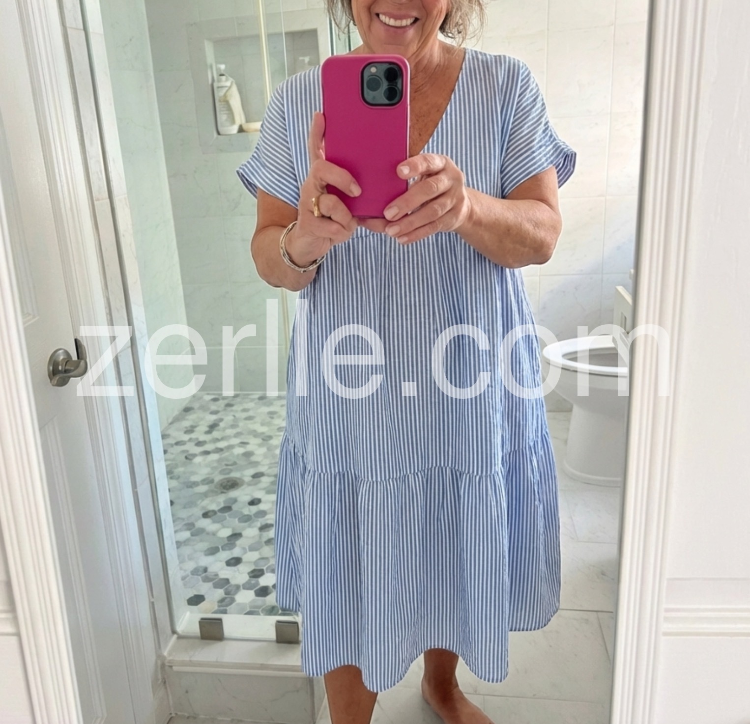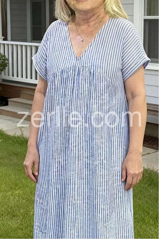 I bought this dress last week and I'm absolutely in love with how airy it feels. The light blue and white stripes look even better in person, and the V-neck is flattering without being too deep. It is the perfect summer casual dress.
