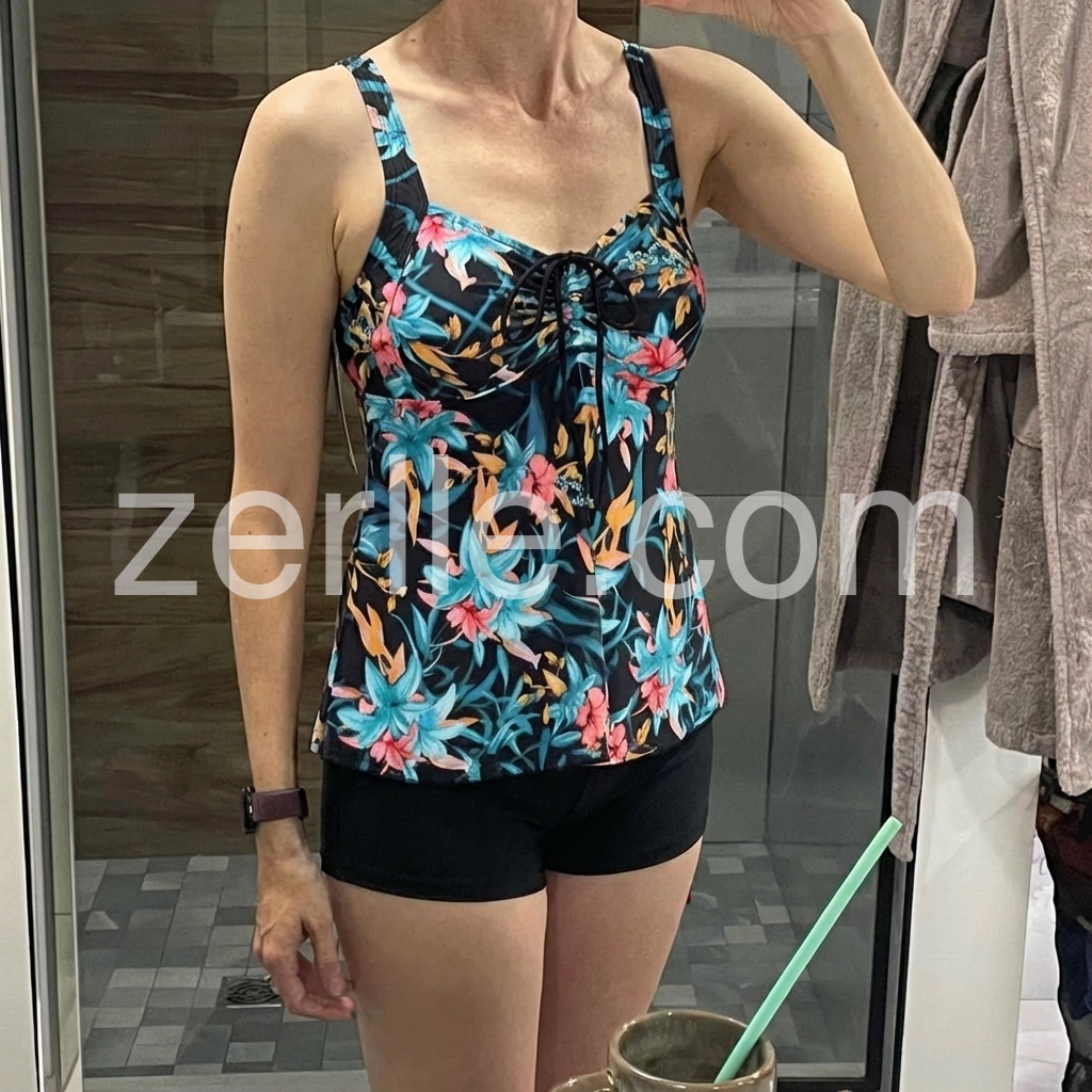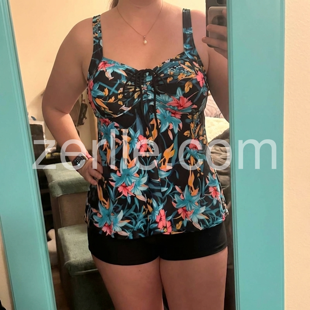 I’m in love with this floral tankini! The dark base with bright blue and pink flowers is so chic, and the tankini top hides my midsection perfectly. The straps are adjustable for a secure fit, and the high-waisted shorts offer modest coverage. It’s lightweight and breathable, great for hot summer days. I’ve received so many compliments—definitely my new favorite swimwear!