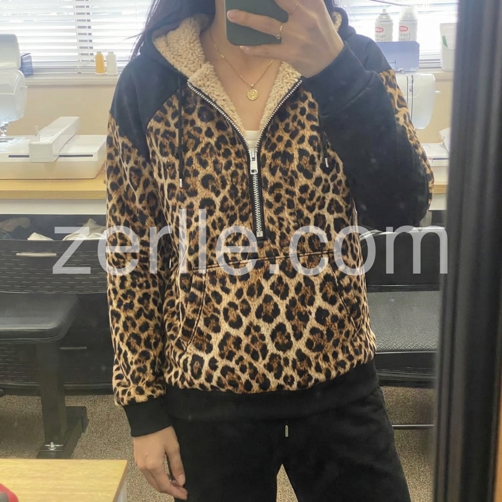 I absolutely love this hoodie! The leopard print is bold but still stylish, and the black base makes it feel super wearable. The zip-up design with the cozy sherpa lining around the hood and front is such a nice touch warm and flattering. I’ve worn it a few times already and it still looks fresh and high-quality.