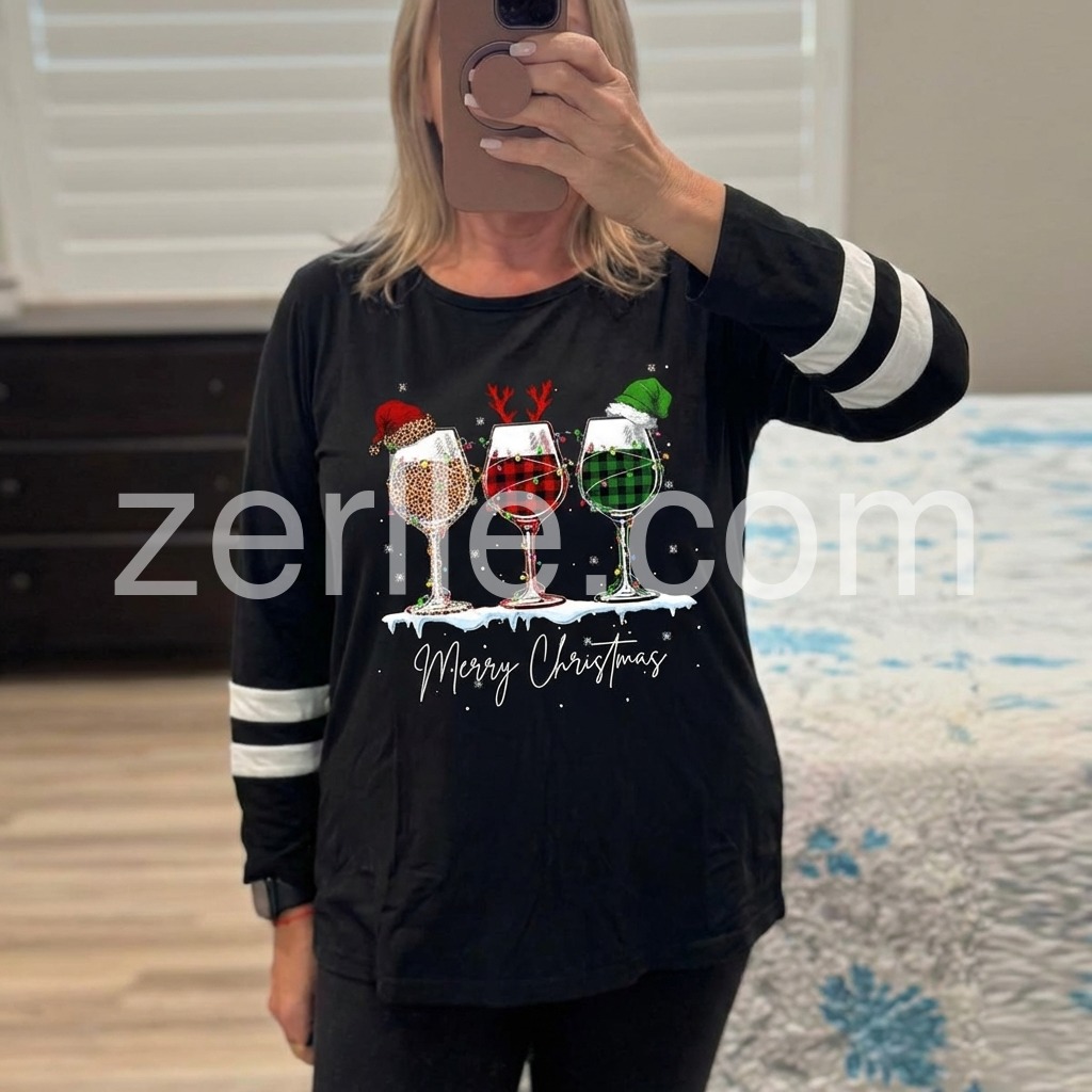 Cute holiday, 3/4 sleeve tunic. Beautiful print with Merry Christmas. Ordered size L. This is a little long for my preference but I can tuck or tie. I am 5’4” and 150.