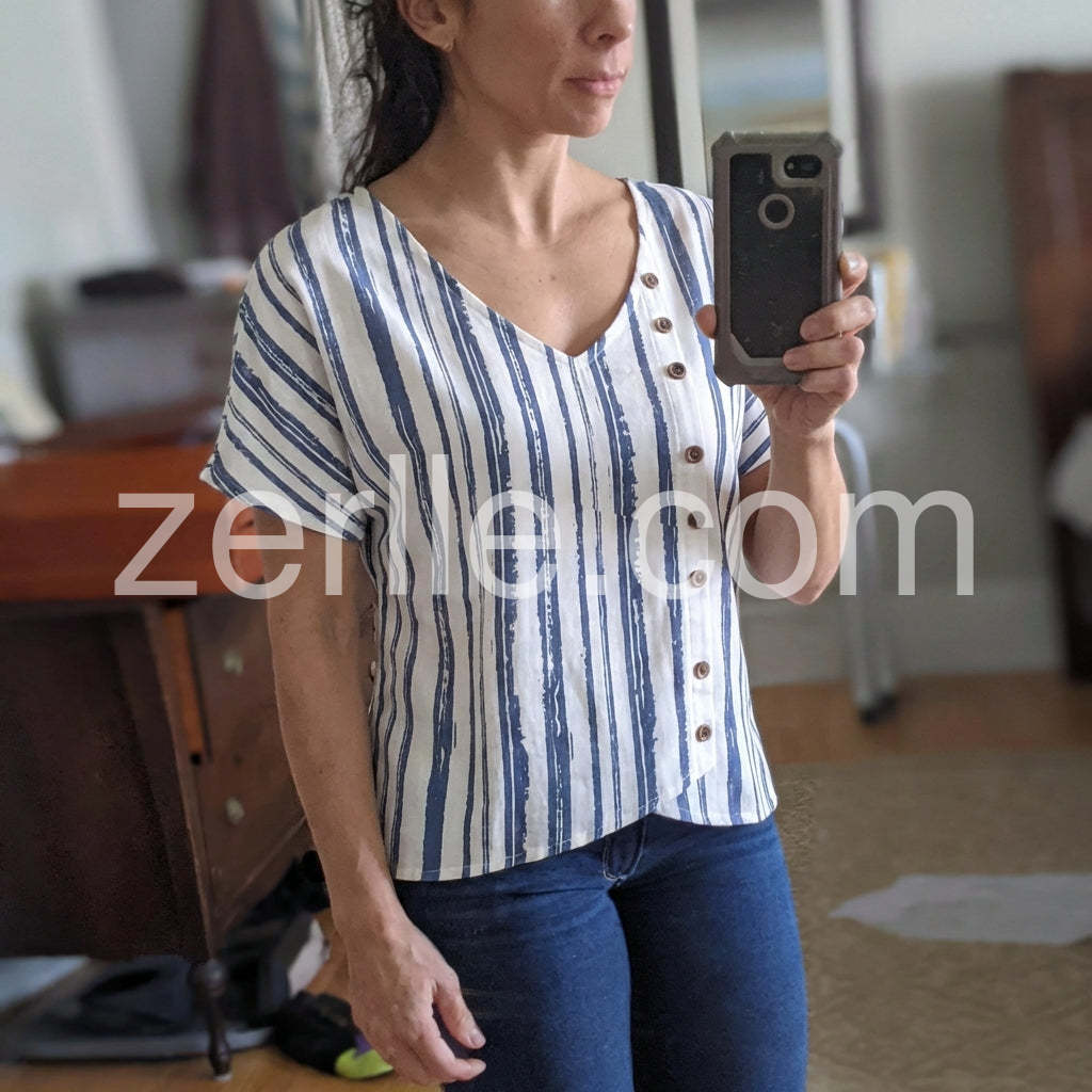 I absolutely adore this blue and white striped blouse. The vertical stripes are incredibly flattering, and the asymmetrical button detail down one side adds just the right touch of uniqueness. I paired it with light khaki shorts for a weekend brunch, and the fit was relaxed yet polished. The fabric feels breathable, and I appreciate how easy it is to dress up with a necklace or down with simple sandals. Highly recommend!