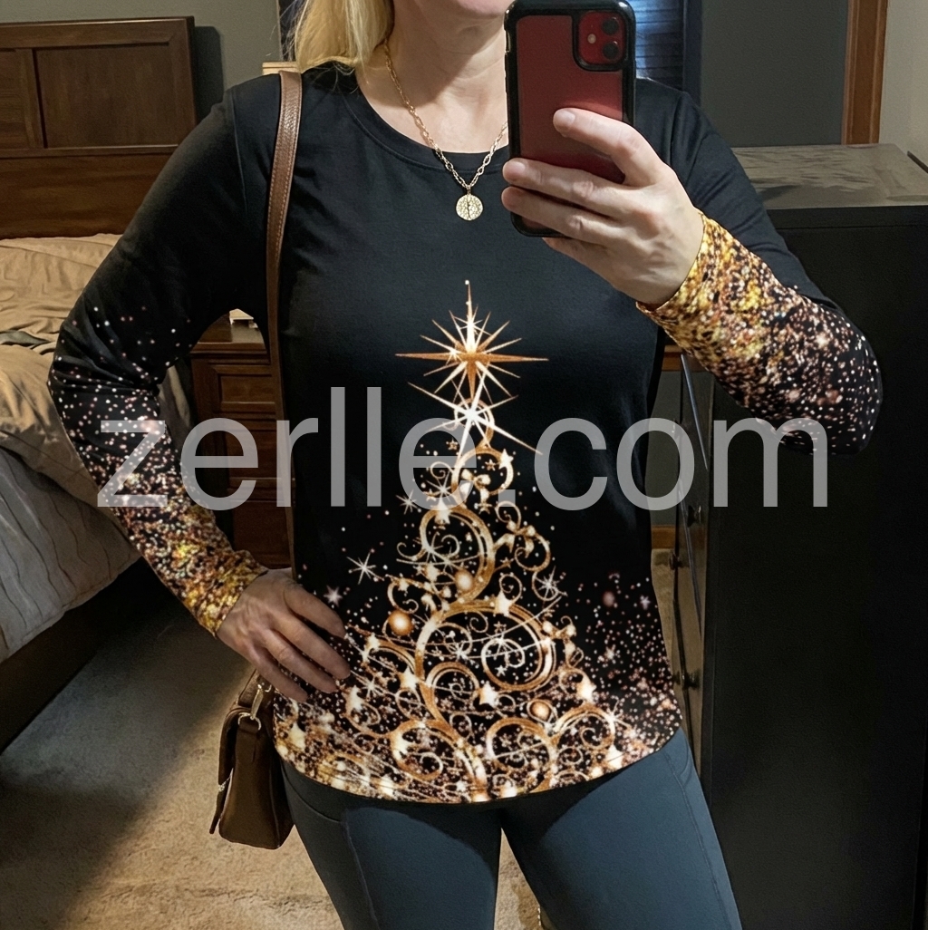 I adore this long-sleeve top! The black base with the golden holiday graphic is such a classic combination. The sleeves are cozy, and the print has that magical sparkly effect that looks even better under daylight and at night. It’s perfect for holiday photos, casual outings, or even just lounging. I’m definitely buying another one in a different design.