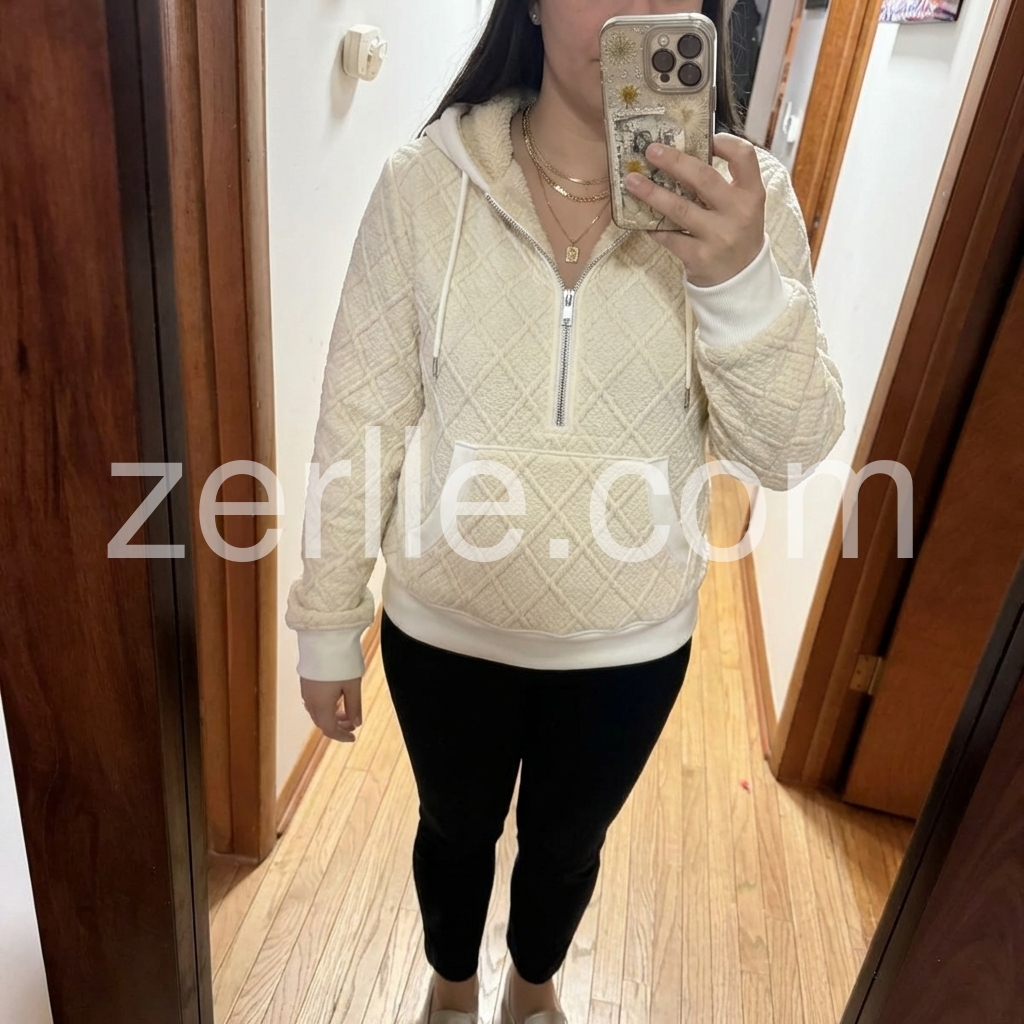 The quality of this hoodie sweater surprised me. The stitching and quilted diamond design are neat and well-made, and the fit feels flattering without being too tight. I also appreciate the zipper and kangaroo pocket; they make it practical for everyday wear while still looking fashionable.