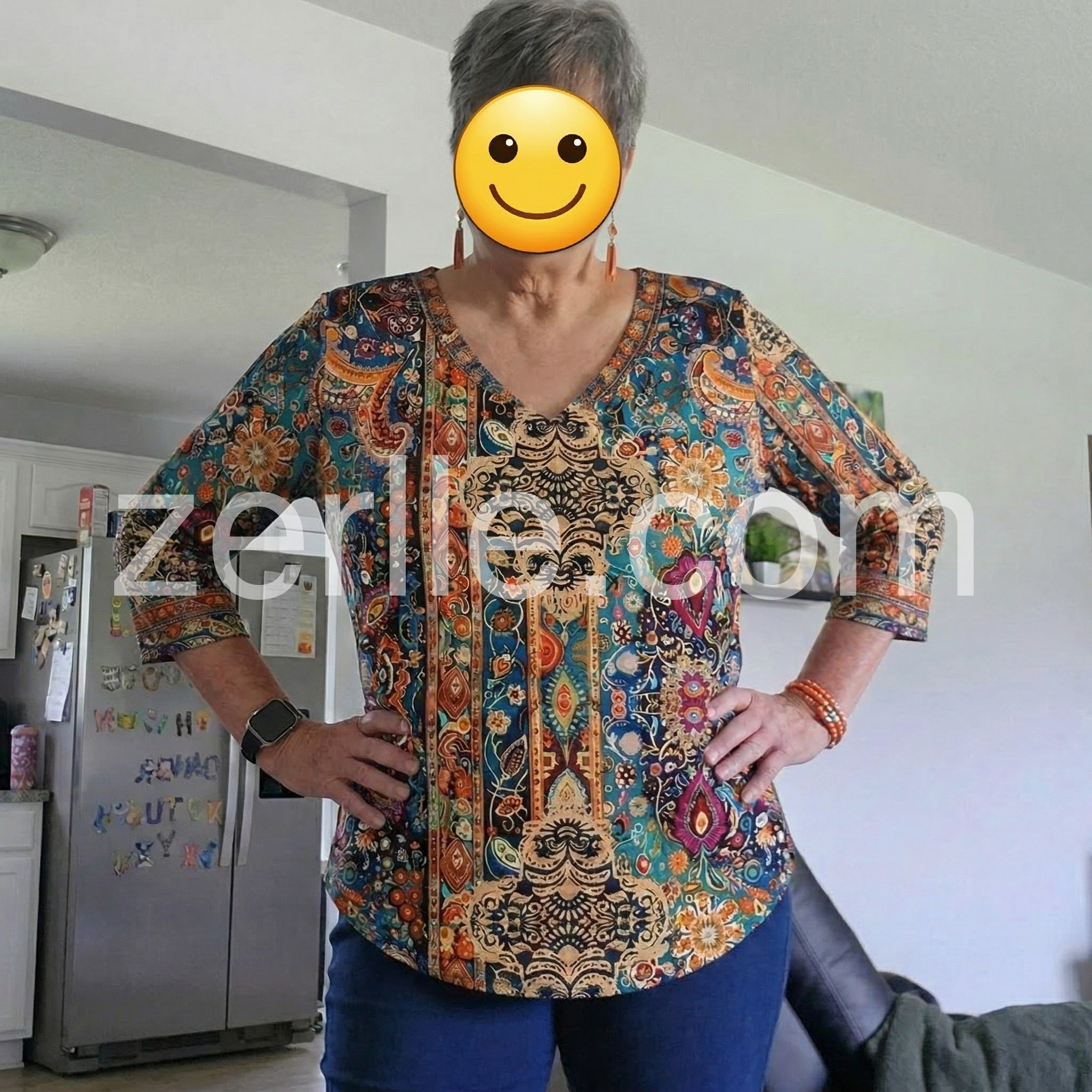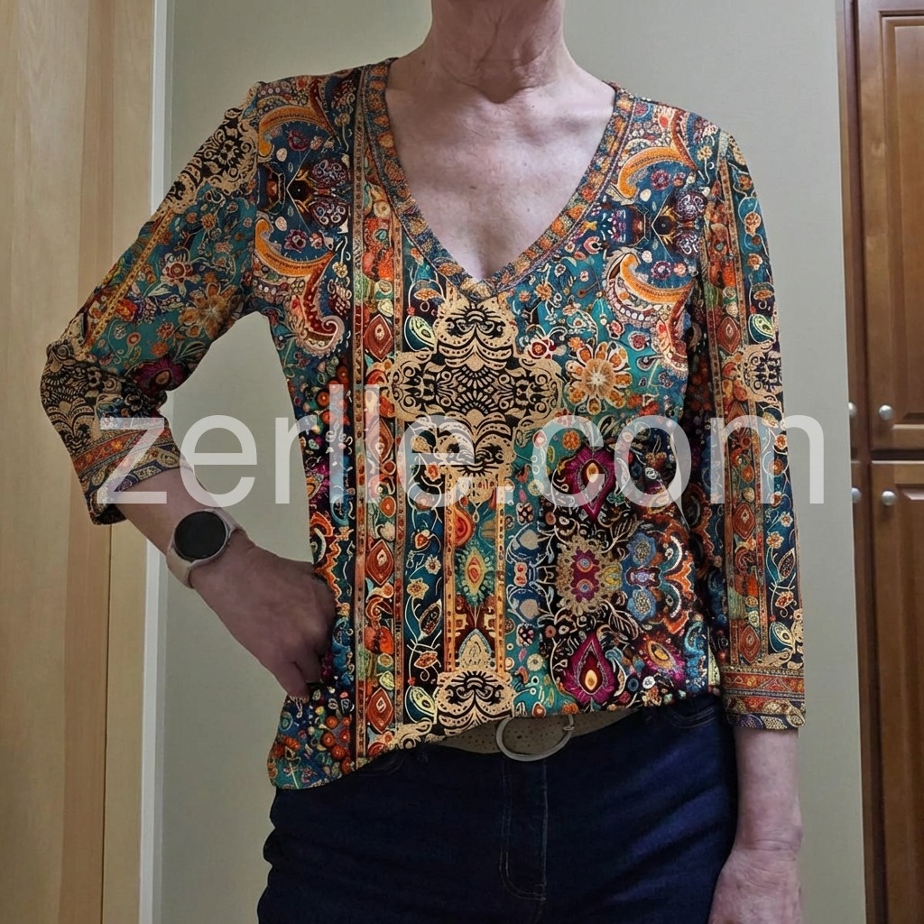 I love everything about this blouse. The colors are lovely, the material is quality and above all the 3/4 sleeves comfortable. I highly recommend this beautiful blouse.