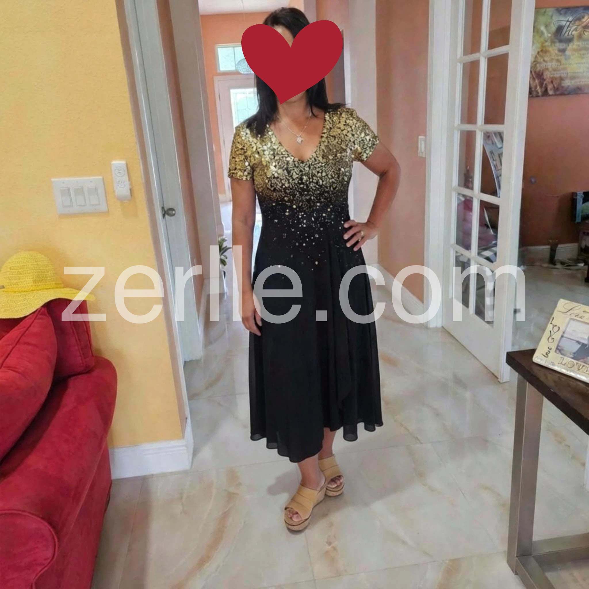 Beautiful dress for a holiday party! The sequins on the bodice catch the light perfectly without looking cheap. The skirt drapes beautifully and hides any tummy insecurities. I ordered my usual size and it fit like a glove. Will definitely buy from this brand again.