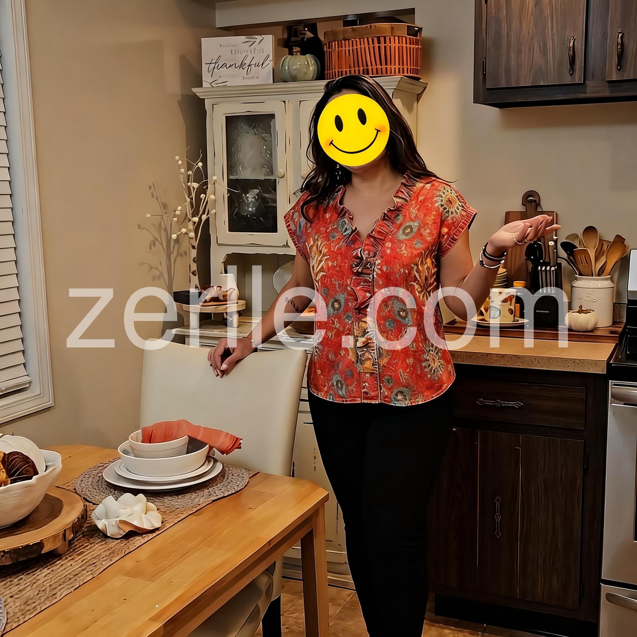 Absolutely fantastic top! The fit is spot on and the ruffled V-neck is super flattering. I love the vintage, faded look of the red background mixed with the bright blue and yellow floral accents. It is my go-to shirt when I want to look put together but remain comfortable.