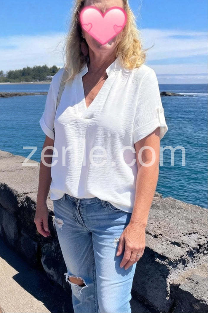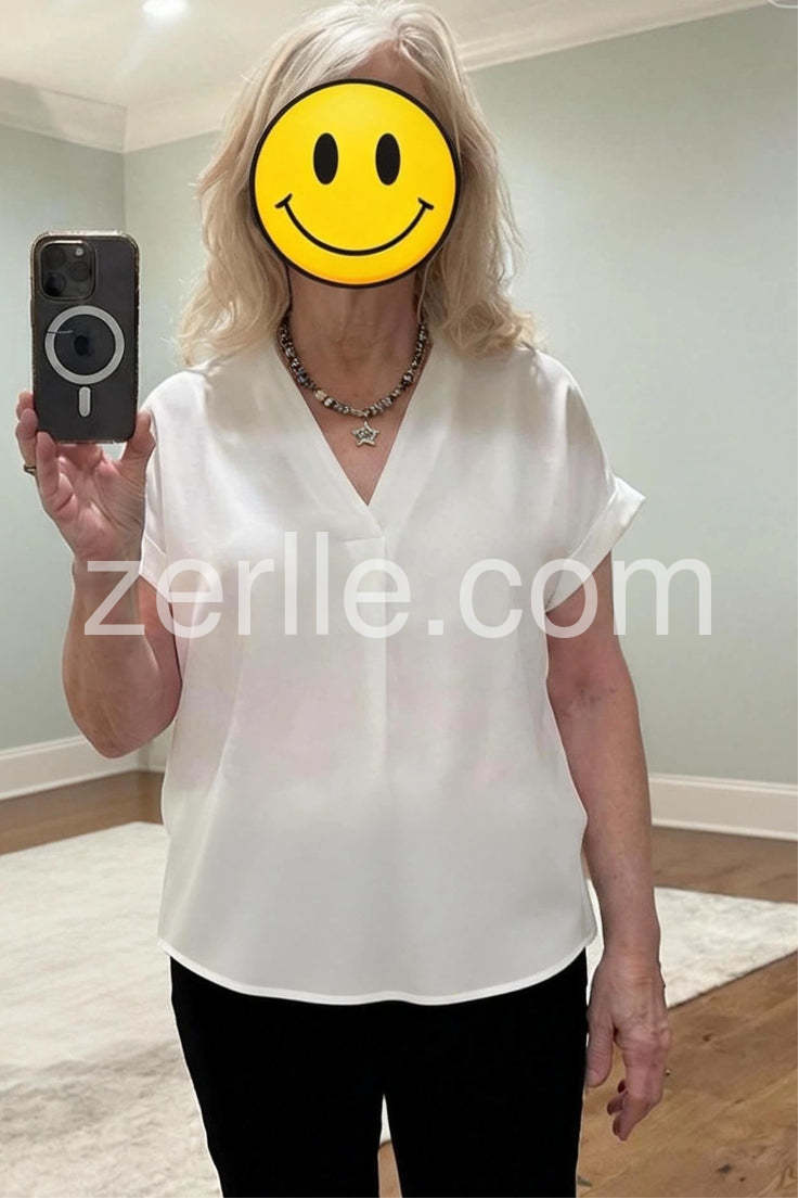 This shirt is so amazingly cute, travels well and can be tucked in or not !! Iβve gotten lots of compliments. The V-neck and short sleeves are flattering and feminine, and the fabric feels comfortable and breathable. Perfect for dressing up or casual wear. Highly recommend!