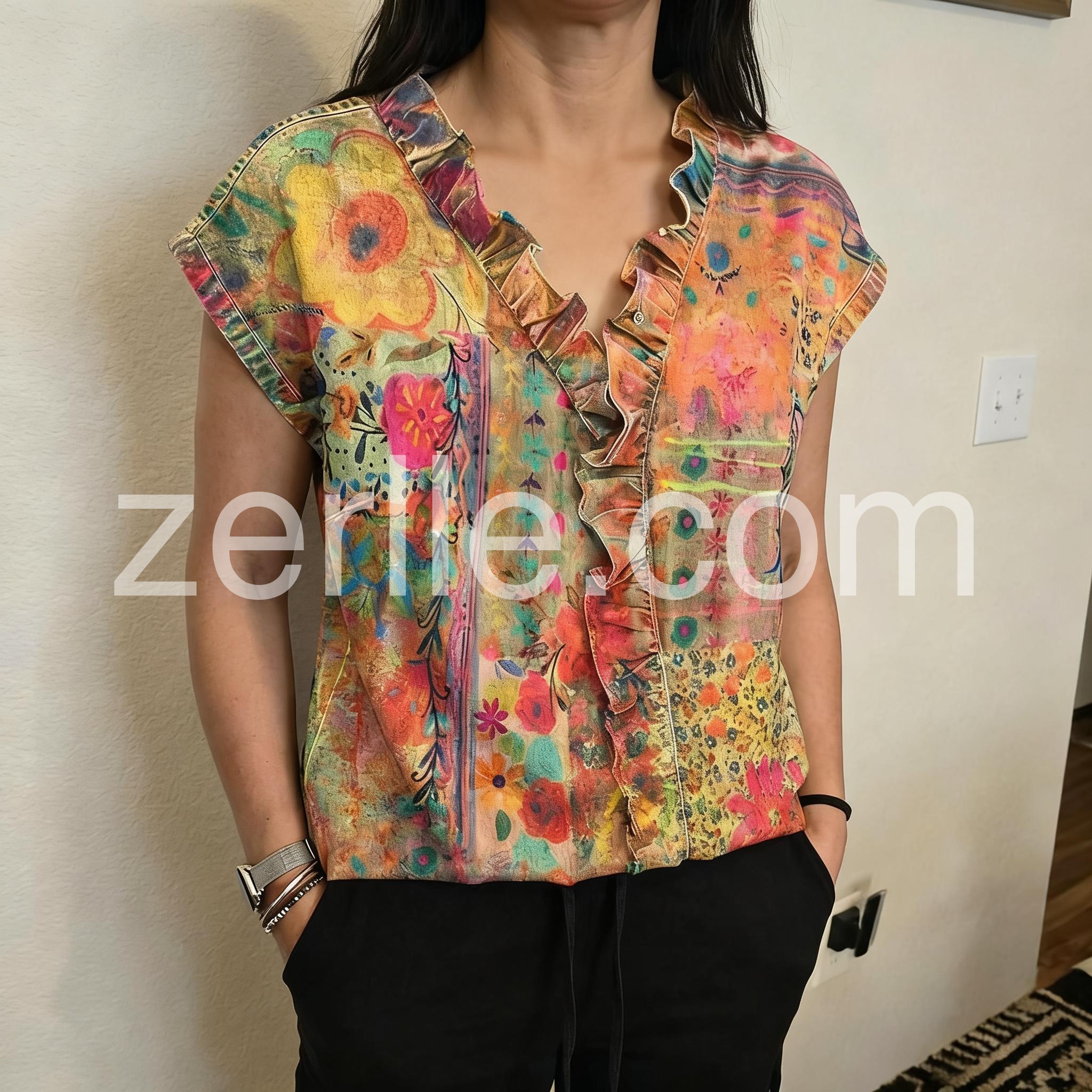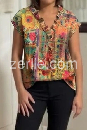 This has quickly become my go-to top. The v-neck with the little ruffles is super cute. It washes really well on the delicate cycle and the colors haven't faded one bit. Great purchase.