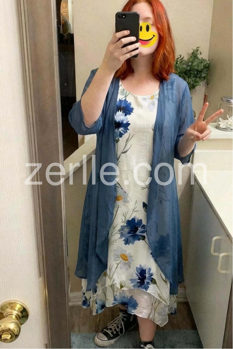 Discover the perfect blend of comfort and elegance in this Elegant Blue Floral Print Midi Dress With Jacket, a chic two-piece ensemble that captures the essence of relaxed summer sophistication. The dress features a soft, flowing silhouette crafted from lightweight, breathable fabric—likely cotton or linen blend—with a white base adorned by a watercolor-inspired floral print of bold blue cornflowers, delicate daisies, and green stems, evoking a garden-in-bloom aesthetic. Its sleeveless design and asymmetrical hem add modern flair, while the relaxed fit ensures all-day comfort. Paired with a long, open-front denim duster cardigan in a soft chambray blue, the look is elevated with effortless style—perfect for layering on breezy days or adding a touch of casual polish. Styled here with platform sandals, layered necklaces, and statement sunglasses, it’s ideal for brunch dates, garden parties, or leisurely walks through charming neighborhoods.