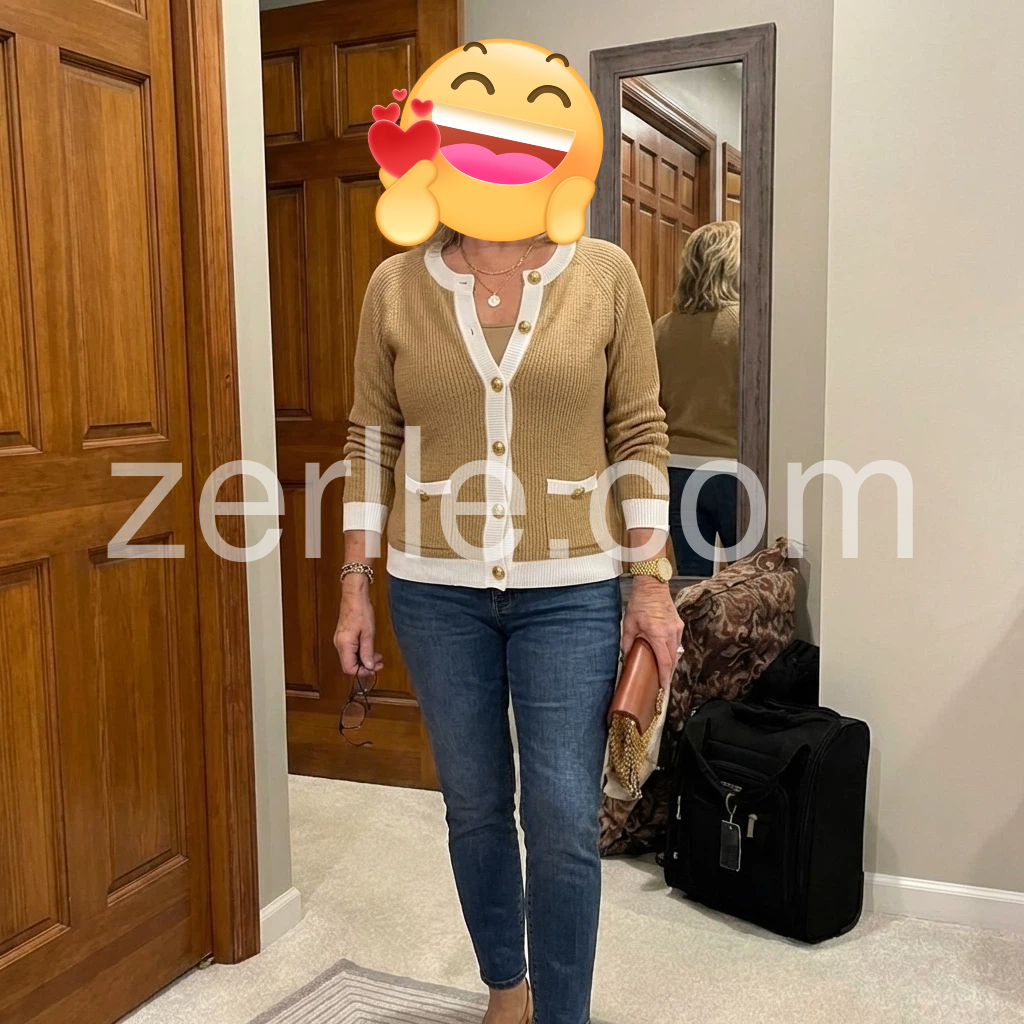 I’m obsessed with this cardigan! The quality is way better than I expected—no loose threads, and the knit is smooth and durable. The camel color is warm and timeless, and the white trim makes it look so polished. The gold buttons are sturdy and stylish, and the fit is true to size. It’s versatile enough to dress up with a skirt for work or dress down with jeans for the weekend. I’ve gotten so many compliments on it already!