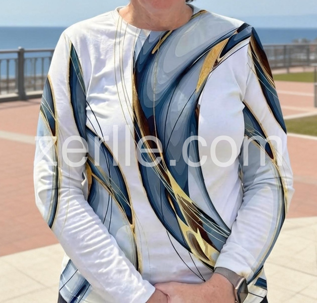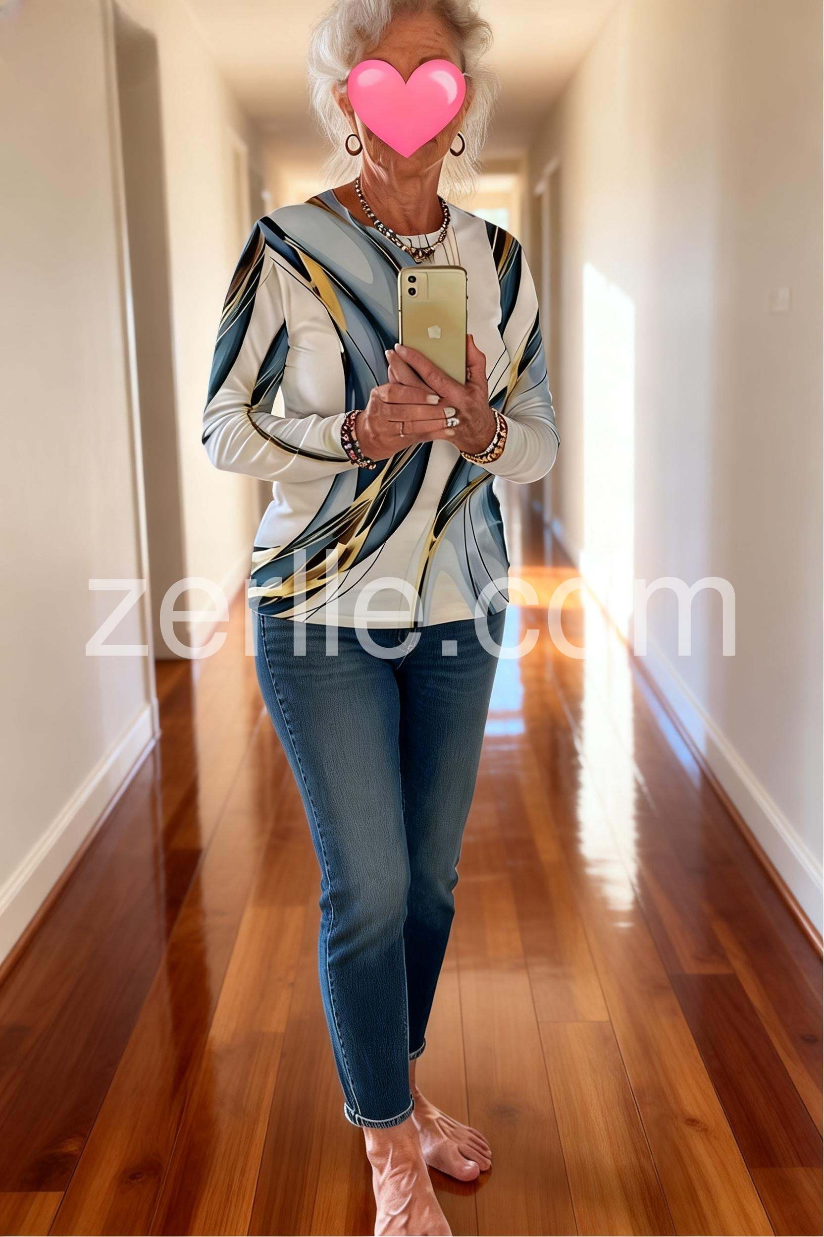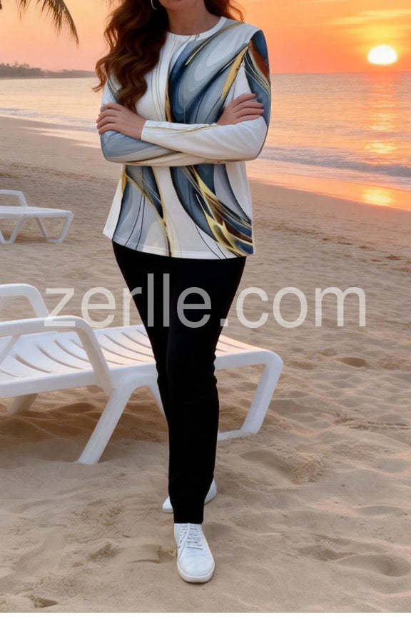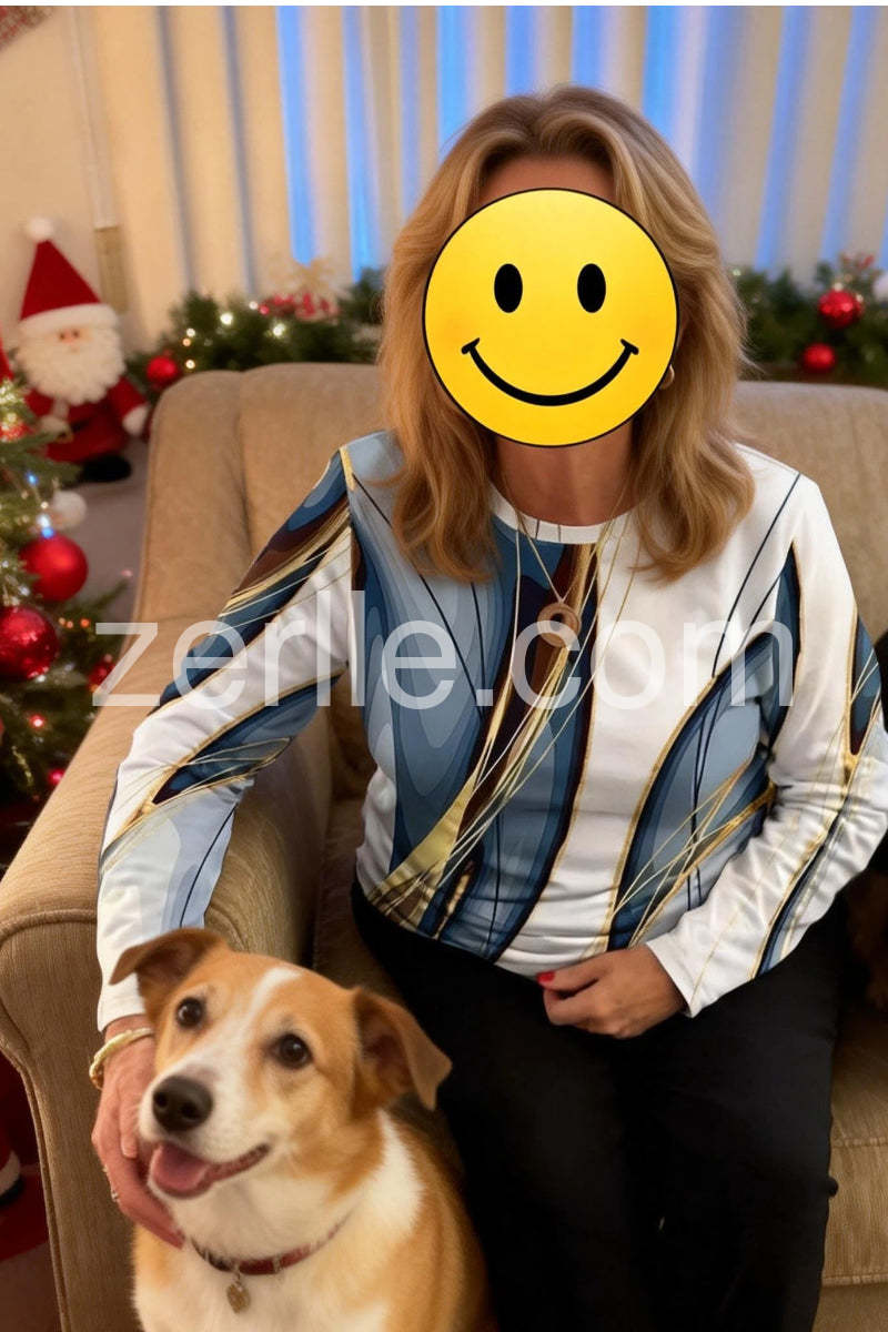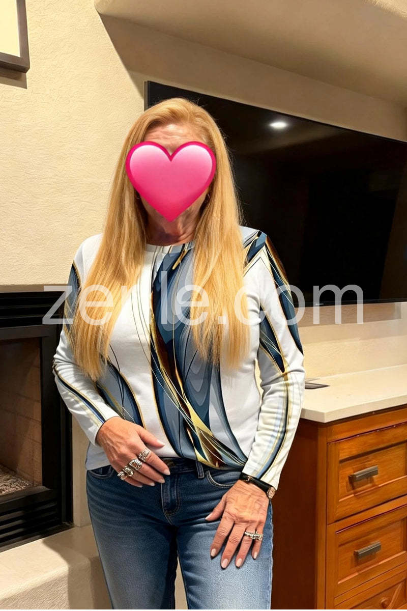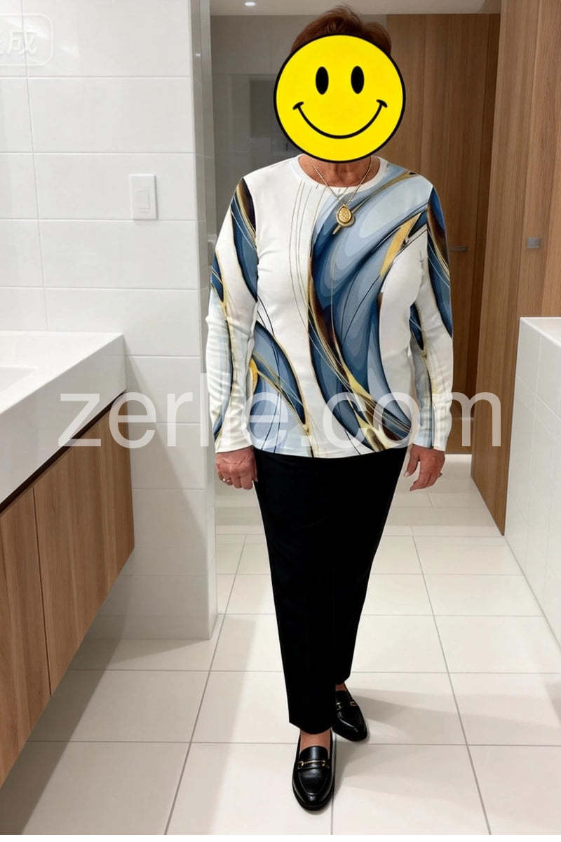 I absolutely adore this top! The abstract design in shades of blue, white, and gold is so eye-catching and unique—it adds a perfect pop of artistry to any outfit. I paired it with black pants and shoes, and it looked effortlessly chic for a casual day out. The colors are versatile enough to dress up or down, making it a great addition to my wardrobe.Love the style.