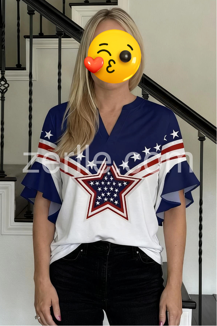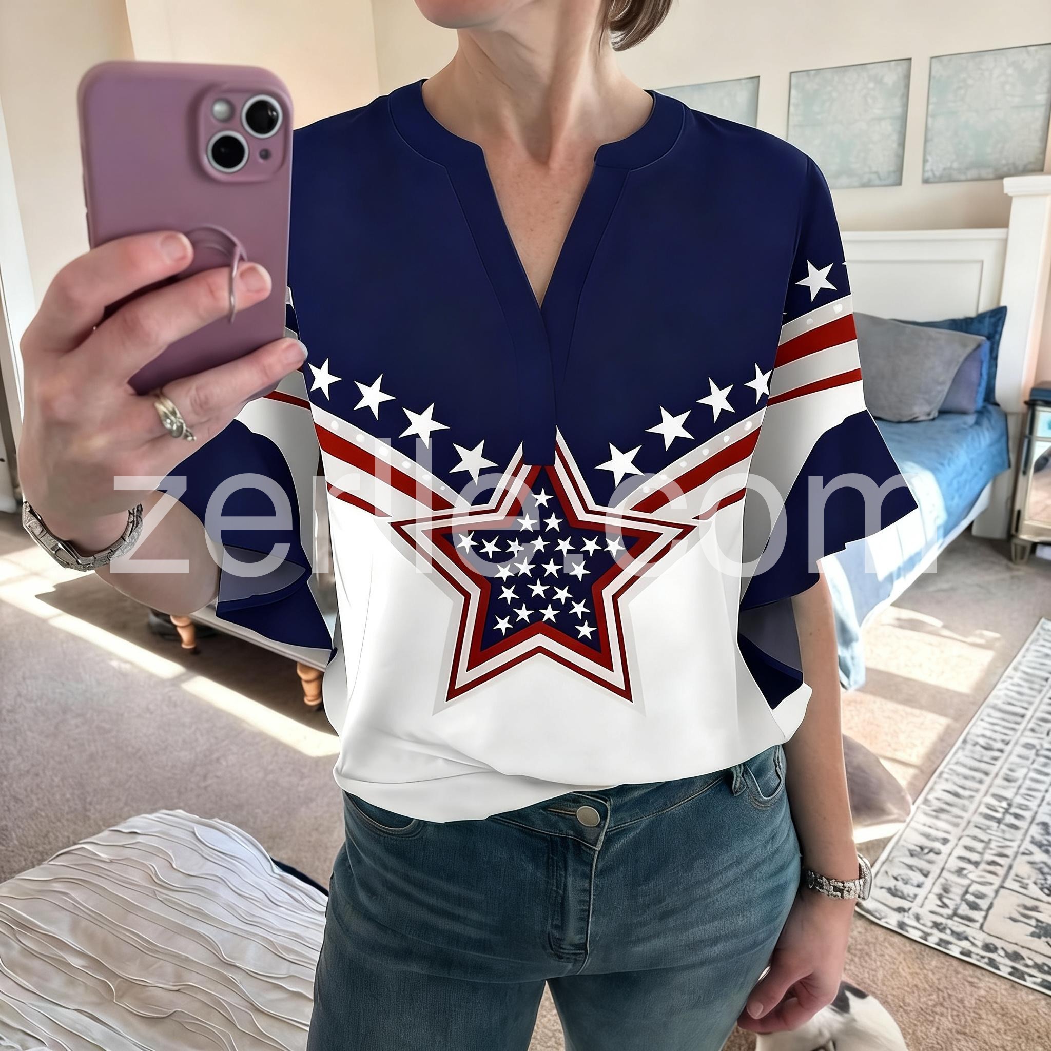 Perfect for the 4th of July! The material is incredibly soft and lightweight. I love the ruffle sleeves, they add such a cute touch to a casual outfit.