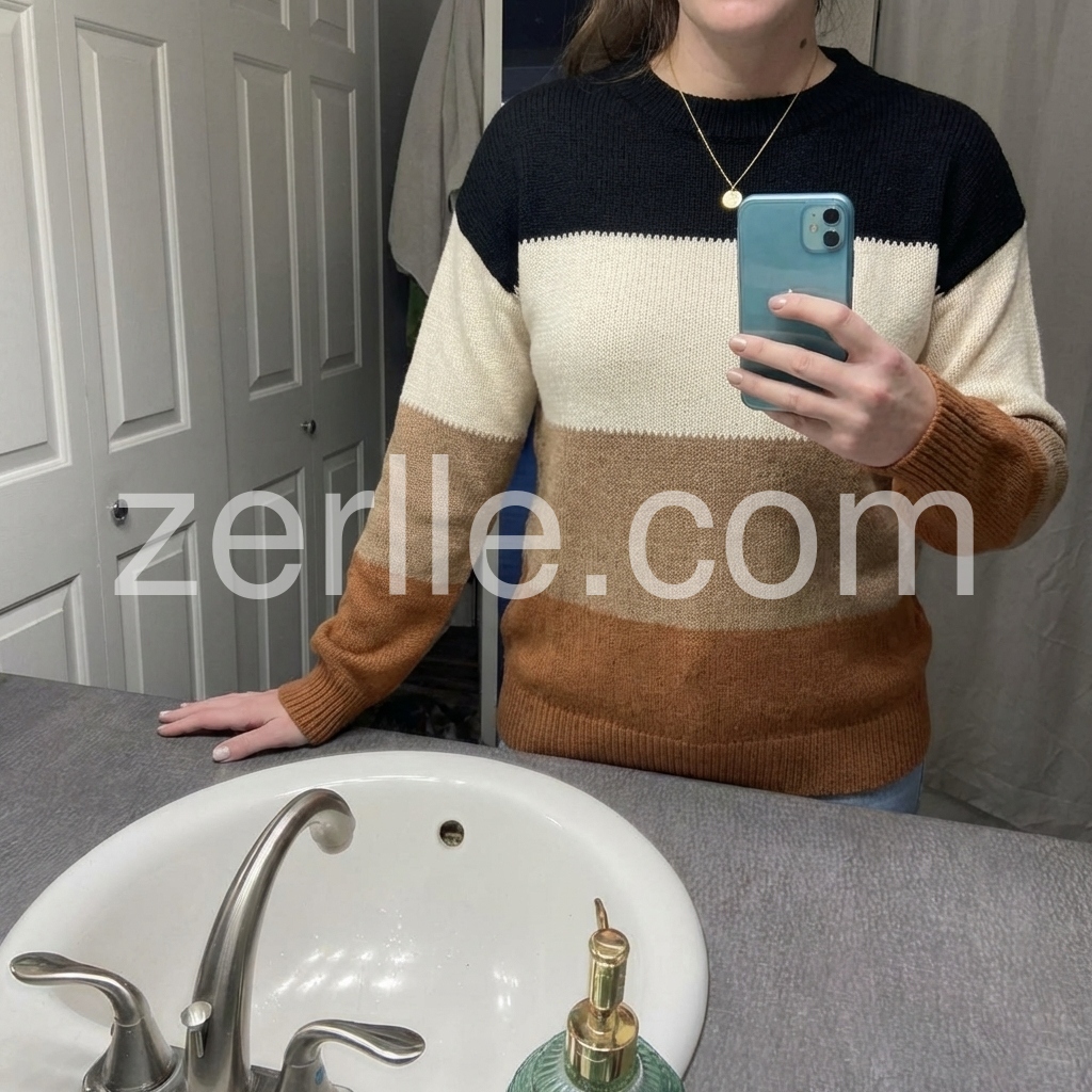 I love this sweater, the fit, the quality, and the color block gives so many more options. Looks great with jeans and also with leggings and boots. 5’1 115 lbs