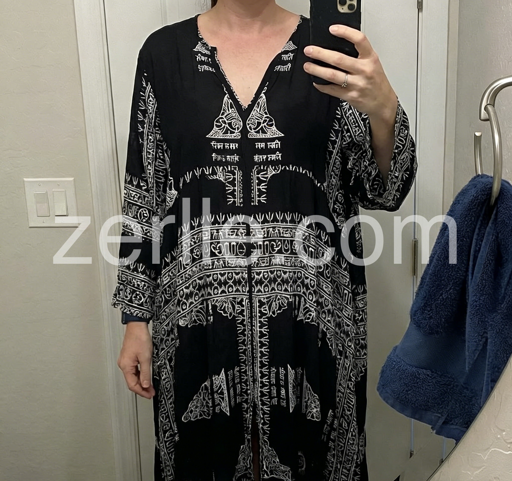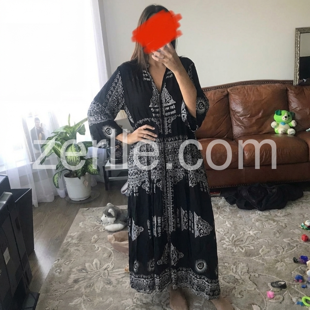 Iβm obsessed with this black and white printed dress! The detailed ethnic patterns add so much character, and the oversized silhouette is both cozy and stylish. The fabric is soft and breathable, ideal for warm weather. Iβve worn it to brunch and a beach picnic, and it always gets compliments. Itβs the ultimate piece for embracing a laid-back, boho vibe!
