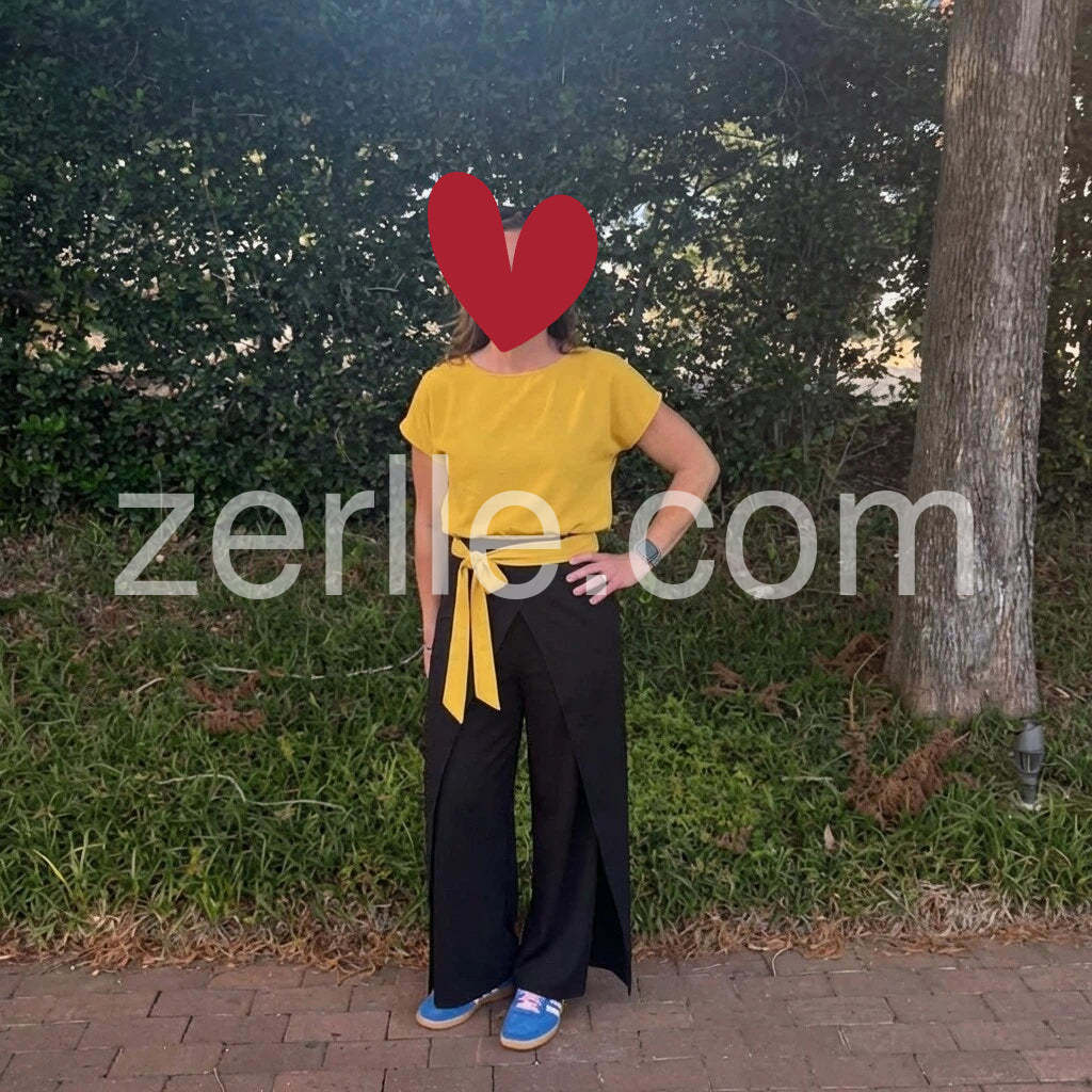 Love the bold color combo! The mustard-yellow top is airy and flattering, and the wide-leg black pants with the yellow waist tie create a chic, modern silhouette. Perfect for casual days out.